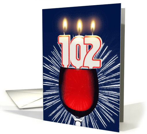 102nd birthday with a big glass of red wine. Fireworks are exploding in the background. Floating in the wine are birthday candles.