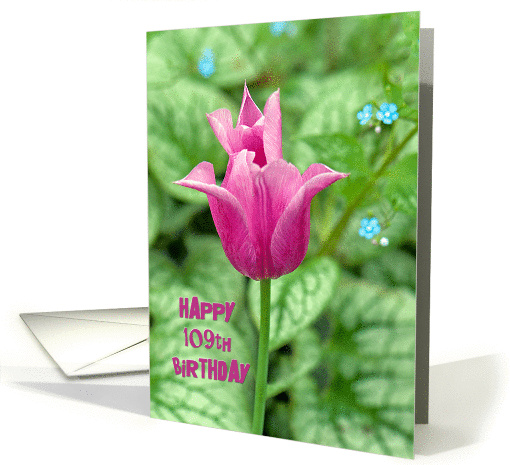 109th Birthday- bright pink tulip with hostas background