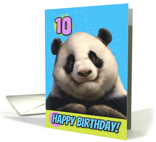 This birthday card features a close-up portrait of a giant panda against a bright blue background with some light-blue grunge type splatter effect. The panda has a gentle, slightly inquisitive expression with its dark, soulful eyes looking directly at the viewer. The image is highly detailed, showing the panda's distinctive black and white fur in a realistic manner. A fun birthday card for those who have a fondness for pandas or wildlife, kids, teens, adults with a playful spirit, conservation enthusiasts, fans of cute or kawaii aesthetics, those who appreciate nature or have an interest in Asian cultures, recipients who have a connection to pandas, and those looking for a gender-neutral card option: The design is suitable for any gender or age group.