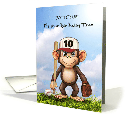 Celebrate a baseball-loving 10-year-old with this fun and energetic birthday card! A cheerful monkey, ready for action with his bat and glove, stands on the field under a bright sky. This playful and colorful design is the perfect way to wish a sports-loving ten-year-old an awesome birthday!