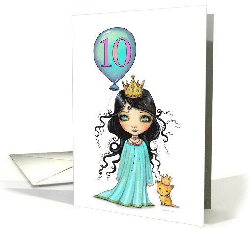 This is a little illustration I did using watercolor, ink and acrylic and digital. A little black haired princess is wearing a jeweled crown is holding a bright teal balloon and her sweet orange tabby kitten is at her side. This birthday card is sure to delight any little girl who is turning 10, especially one who love cats!