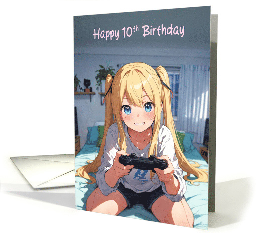 Celebrate turning 10 with this bright and bold birthday card featuring a confident blonde gamer girl caught mid-play! With long pigtails, sparkling blue eyes, and a cheeky grin, she sits comfortably on her bed, controller in hand, fully focused on her next big win. Dressed in a loose graphic tee and shorts, she’s relaxed and full of personality. The digital anime-style illustration pops with colour and detail—from the neatly made bed and scatter cushions to the soft lighting, potted plants, and shelves in the background. A soft pink "Happy 10th Birthday" message floats overhead, tying it all together with a cheerful vibe. Perfect for any game-loving daughter, sister, cousin, or friend who’s always up for a challenge, this card is a brilliant way to say “Game on!” as they enter double digits with joy, confidence, and style.