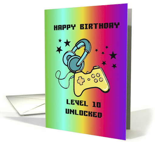 The image has a fun, colorful design with a rainbow background. In the center, a bright yellow game controller and cool blue headphones are surrounded by black stars for an extra playful touch. At the top, 'HAPPY BIRTHDAY' is written in a pixel-style font, and at the bottom, 'LEVEL 10 UNLOCKED,' making it perfect for a little gamer’s special day!
