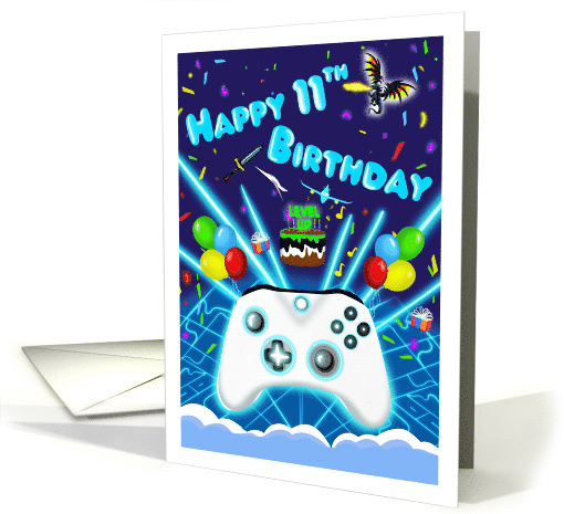 This vibrant gamer-themed card brings a 11th birthday to life with a detailed game controller, playful dragons, airplanes, balloons, confetti, and a “Level Up” chocolate cake. Packed with fun, wacky details, it perfectly captures the excitement of a video game world ideal for young gamers who love adventure, colorful illustrations, and playful birthday fun.