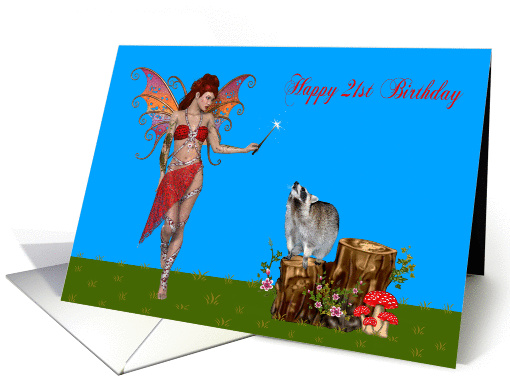 Wish anyone a Happy 21st Birthday with a card featuring a sexy fairy girl with wings, tattoos and a magic wand next to an adorable raccoon standing on a tree stump with flowers and mushrooms. Inside like all GCU cards can be personalized by you if you wish.
