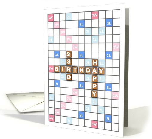 23rd birthday card for someone who loves to play word games. The letters spell out 'Happy 23rd Birthday to you.' The background picture is a word game board.