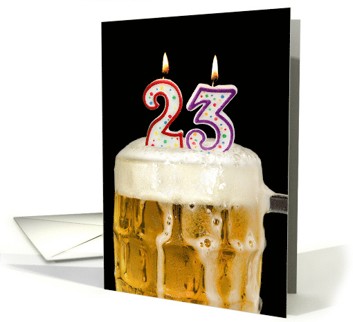 Close up of number 23 candle with flames in beer mug isolated on black for 23rd birthday.