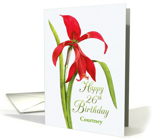Jubilant red lily on a light blue sky background with leaf green happy birthday text is filled with warm wishes and love for someone special on their 26th birthday. Adding custom name makes it extra special. Design by Anura Design Studio.