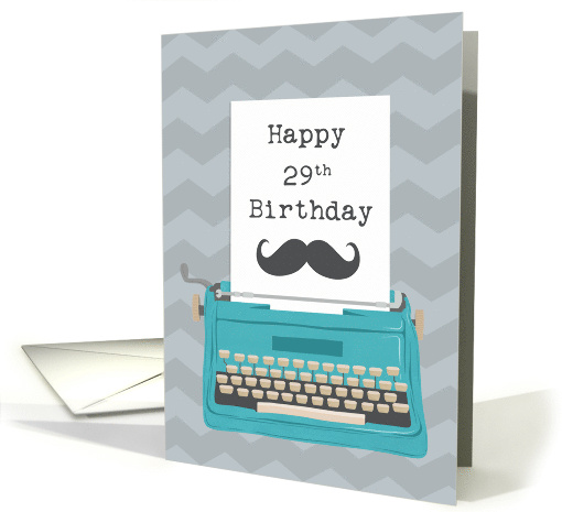 A teal vintage typewriter with a zig zag background. A piece of paper from the typewriter which has the words Happy 29th Birthday in typewriter font and a silhouette moustache. A lovely birthday card for someone special turning 29.