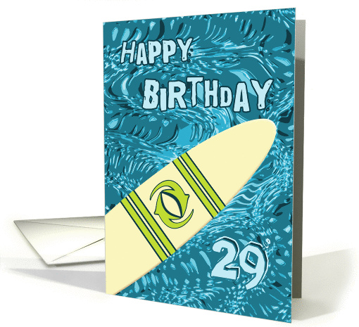 Do you know a surfer who's turning 29? Then here is the perfect card with a surfing theme. Cream and green surfboard with stylized ocean background and a little surfing humor in the verse. They'll love it! Available for ages 10-80 or many specific relations, Dad, Brother, etc. ©PamJArts