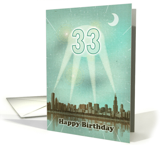 33rd birthday retro movie poster card. An unusual card created to look like an old movie poster. Spotlights from the city light up the age over a peaceful city.