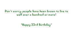 Wish someone a Happy 33rd Birthday with an adorable raccoon and Pomeranian talking over the life expectancy of a human. Background is orange with a yellow balloon and green text.