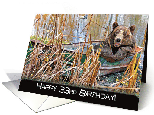 Grinning brown bear in rusty old row boat and pond weeds for 33rd birthday.