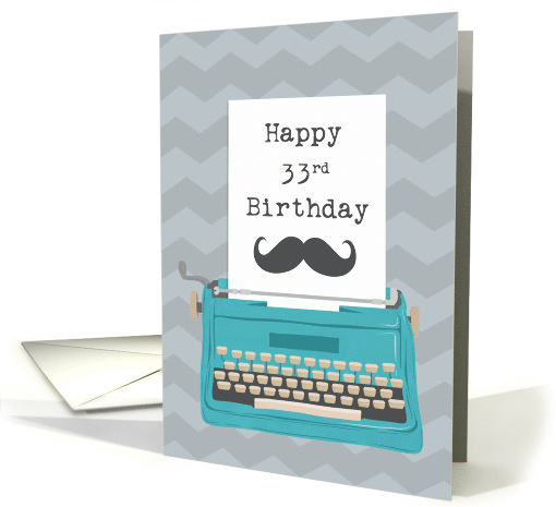 A teal vintage typewriter with a zig zag background. A piece of paper from the typewriter which has the words Happy 33rd Birthday in typewriter font and a silhouette moustache. A lovely birthday card for someone special turning 33.