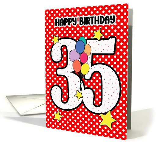 Give a big, bold, and festive 35th birthday greeting with this design featuring a colorful bunch of balloons and whimsical yellow stars on a field of polka dots.