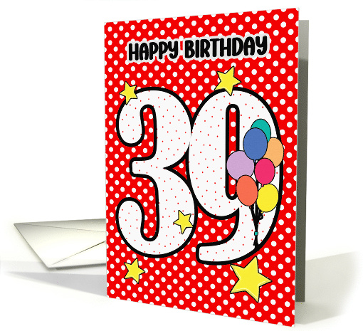 Give a big, bold, and festive 39th birthday greeting with this design featuring a colorful bunch of balloons and whimsical yellow stars on a field of polka dots.