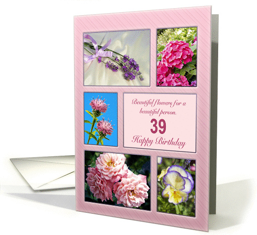 Send beautiful flowers to a beautiful person with a floral card. A 39th birthday card with a beautiful sentiment. A collection of framed pictures of flowers on a pink background.