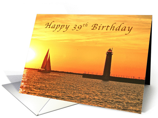 A stunning sunset over Lake Michigan with a sailboat and lighthouse. The scene makes a beautiful setting to wish someone a happy 39th birthday. A great card for someone who loves sunsets, sailing, lighthouses or just being by the water.