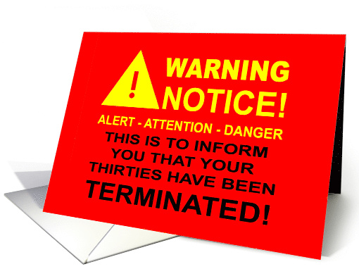 Humorous fortieth birthday card with a warning notice! Alert, attention, danger, This is to inform you that your thirties have been terminated! Inside says, Happy 40th Birthday!