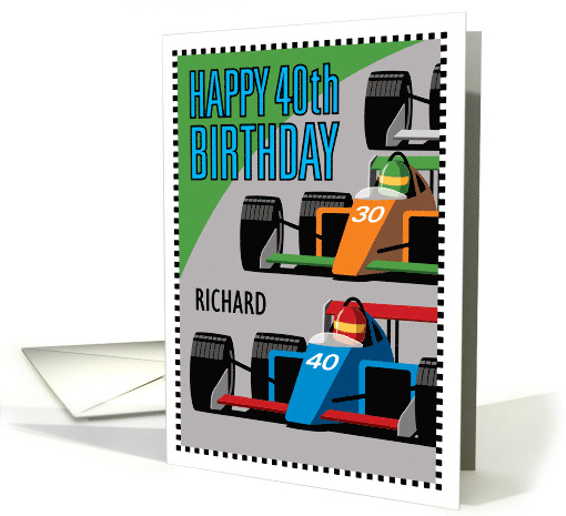 Illustration of two formula one race cars one blue with the number 40 and behind is a orange car with the number 30. Happy 40th birthday customize name.