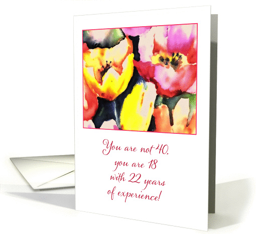 Wish that special person, who has turned forty, a Happy Birthday with this card featuring a watercolor painting of bright tulips and the text: "You are not 40, you are 18 with 22 years of experience". You can edit text inside card. Custom requests welcome.
