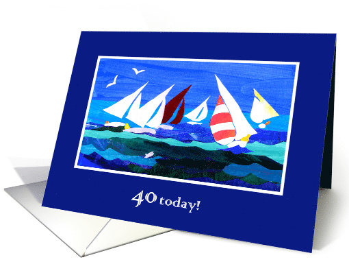 An age-specific birthday card with sailing boats, seagulls and fish, from a digital capture of a hand-painted paper collage by Judy Adamson. There is a dark blue border with the words, '40 today!' in white lettering.