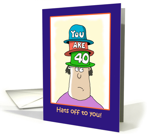 A brightly coloured blue green and red comic cartoon card that shows a male cartoon character wearing three hats with words that read `You are 40`. The caption beneath the frame is `Hats off to you!` The caption inside the card is `Have a great birthday!`