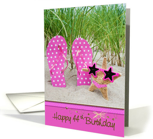 Starfish wearing pink star sunglasses and polka dot bikini in beach sand with polka dot flip flops for 44th birthday.