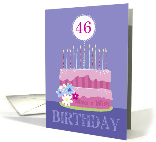 46th Birthday Cake greeting card design in Pink, set on a Purple background, with distressed style lettering, set on a glossy card. ©DaleSimpson