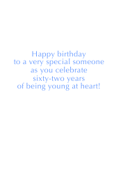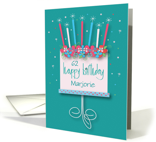 This very special teal-colored birthday cake card will help you celebrate someone special's 62nd birthday. Not only will the white cake, decorated with both bright flowers and vivid candles, help you to wish them a Happy Birthday, the hand lettered blue wording, along the side of the cake, will also send your wishes. "Happy Birthday" is written there, right above an area where you can type in the birthday friend or family member's name, as you order their card and right below where you can change the age of the birthday celebrant, on the card, if needed. A lovely white curly-legged cake stand fills the lower part of the card, below the floral cake. The inside wording says "Wishing you a bright and happy birthday!"