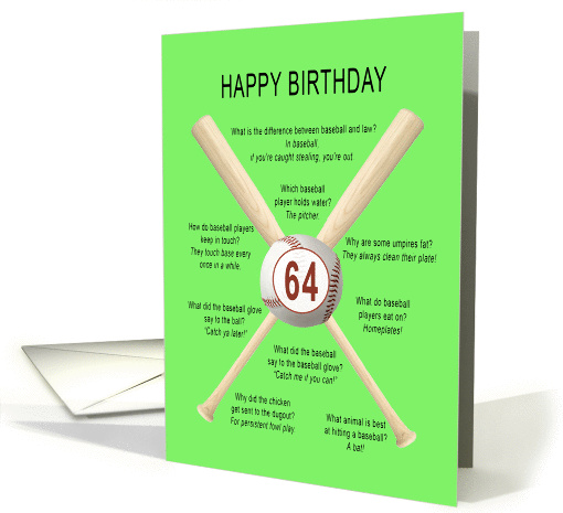 64th birthday card. A fun card showing a baseball and bats with lots of really bad baseball jokes. A card for the sportsman with a sense of humor. See the whole range of ages and relationships in my store.