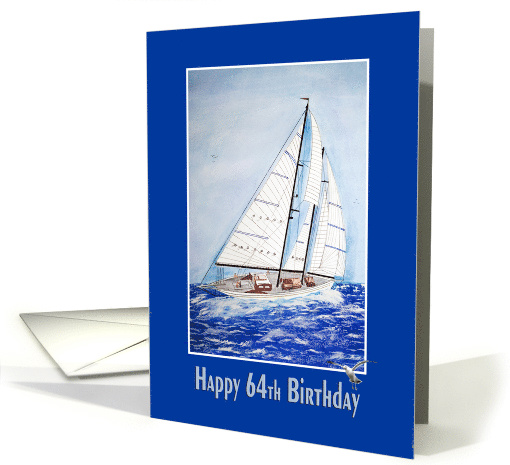 Sailboat heeling on rough seas in blue frame for 64th birthday. Watercolor by Lee De Voss Holland, Michigan