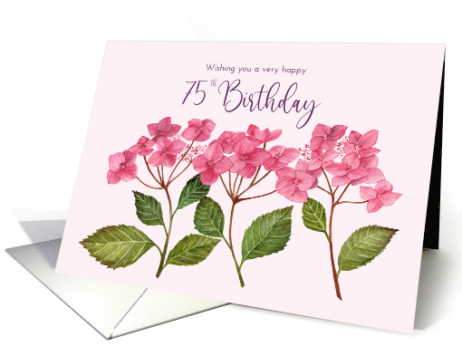 Share the beauty of nature with our elegant greeting card, featuring a stunning watercolor illustration of pink hydrangea lacecaps. This botanical design is sure to uplift spirits and bring a touch of summer joy to anyone who receives it. The card design is for 75th Birthday.