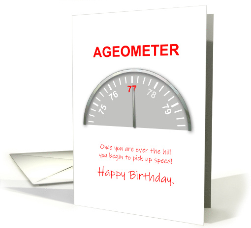 A funny 77th birthday car showing an ageometer pointing to the age 77. A humorous way to wish a happy birthday.