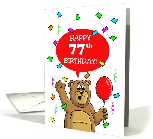 77th Birthday Card with a Cartoon Bear, Balloon and Confetti