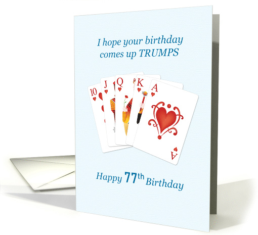 A 77th birthday card for someone who loves to play cards. A royal flush of hearts and the words 'I hope your birthday comes up trumps.'