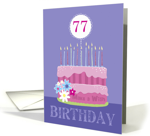 77th Birthday Cake greeting card design in Pink, set on a Purple background, with distressed style lettering, set on a glossy card. ©DaleSimpson