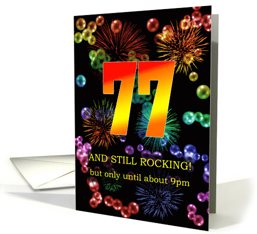 Celebrate a 77th birthday with a funny card. Still rocking, but only until 9pm has a ring of truth that will give a laugh. A great birthday card for the ageing rocker in your life.