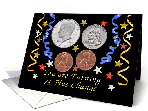 A collection of coins totaling 77 cents to represent a 77th birthday. A nice age specific card for that special person who is turning 77.