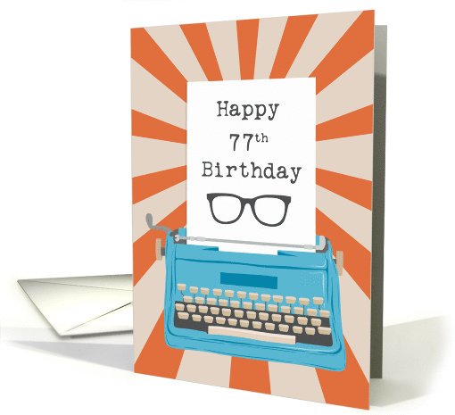 Happy 77th Birthday with Typewriter Glasses & Sunburst Background