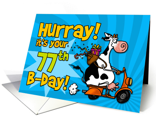 A cute black and white cartoon cow with a birthday present in its backpack riding an orange scooter on a blue striped background with the text "Hurray! it's your 77th B-Day!" Perfect fun birthday card for a 77 year old.