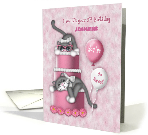 Customize with your child's name. An adorable kitten with pink glasses is perched on top of a three tier pink cake. A cute sleeping kitten is sleeping on the bottom tier of the cake, There are two floating balloons in the back ground that read "You're so sweet".. Inside of card reads, " Best Birthday wishes for an adorable little girl. Happy Birthday!" Inside message can be changed by you.