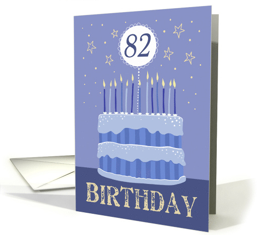 82nd birthday cake greeting card design in shades of blue and with distressed style lettering, set on a glossy card. ©DaleSimpson