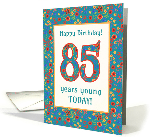 A pretty Age-specific Birthday Card for an 85-year-old, with the number 85 and the border filled with a colourful retro floral pattern on a teal background. The floral pattern is from a digital capture of a hand-painted paper collage by Judy Adamson. The numbers are outlined in red, the border in yellow and the front cover greeting, 'Happy Birthday! 85 years young TODAY!' are in teal to match the background of the pattern. You can also personalize the inside message.