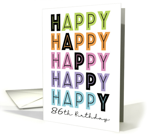 Typography lettering of multiple Happy in 5 different colors so that the recipient focuses on the happies instead of the years. Great for a 86th birthday. İMindy Pierce