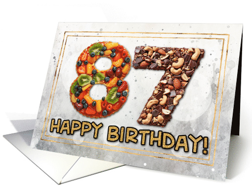 A delicious birthday mixed fruit cake, and a chocolate nut cake in the shape of a number 87 on a grey watercolor grunge splatter background with a gold colored trim and the text "Happy Birthday!" in a gold colored glitter effect. A perfect card to send to that wonderful 87-year old for their birthday.