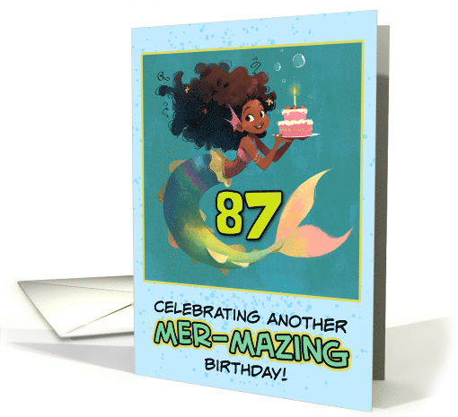 Deep in the ocean, a cute black/african american mermaid is holding a big pink birthday cake with a candle on top just for you. A mer-mazing birthday is ready to kick off! A fin-tastic card for children and young girls, beach dwellers, fantasy and mythology enthusiasts, fans of animation/movies featuring mermaids, sailors or those in maritime professions, ocean conservationists, and your wonderful 87-year old.