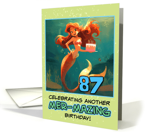 Deep in the ocean, a cute red-haired mermaid is holding a big pink birthday cake with a candle on top just for you. A mer-mazing birthday is ready to kick off! A fin-tastic card for children and young girls, beach dwellers, fantasy and mythology enthusiasts, fans of animation/movies featuring mermaids, sailors or those in maritime professions, ocean conservationists, and your wonderful 87-year old.