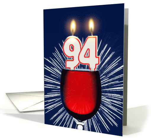 94th birthday with a big glass of red wine. Fireworks are exploding in the background. Floating in the wine are birthday candles.