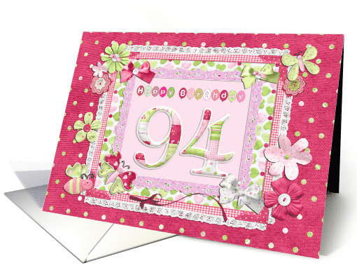 94th birthday card. Ribbons,bows and flowers. A birthday card for a patchworking queen! Laywers of bright colored cloth trimmed with ribbons. Cloth flowers and butterflies decorate this lovely card. Please note that the card is printed.